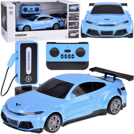 Blaues RC-Rennauto mit realistischen Details und Ladestation wie bei echten Elektroautos – ein Highlight für kleine Geschwindigkeitsfans. Bietet Fahrt vorwärts/rückwärts, Lenken rechts/links, automatisches Einparken, Lichteffekte in 5 Modi sowie Hup- und Musikgeräusche. Im Set enthalten sind wiederaufladbare Akkus für Auto und Station sowie eine Fernbedienung mit intuitiver Steuerung.