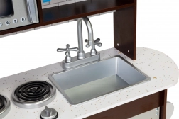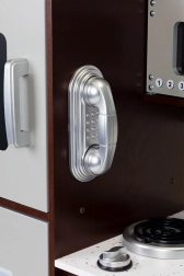 In einer echten Küche haben die Kinder die Möglichkeit, zu backen, zu kochen und das Essen in der Mikrowelle zu erwärmen und danach alle Geschirrteile in der geräumigen Spüle zu waschen und an ihren Platz zu räumen.