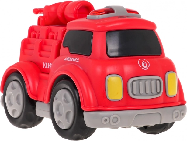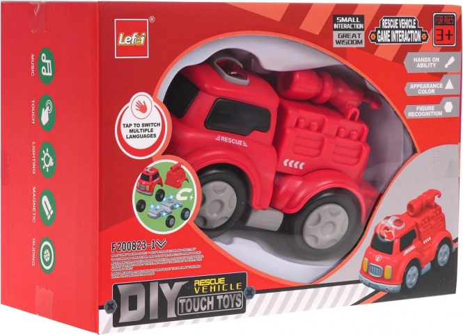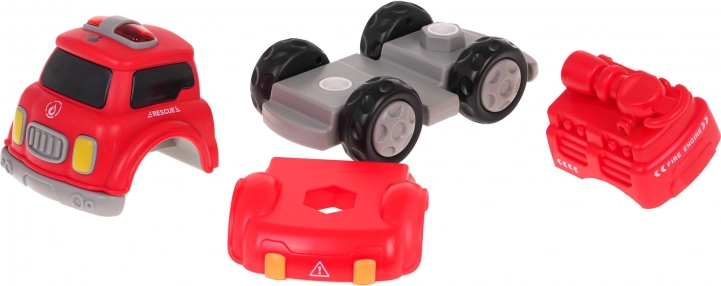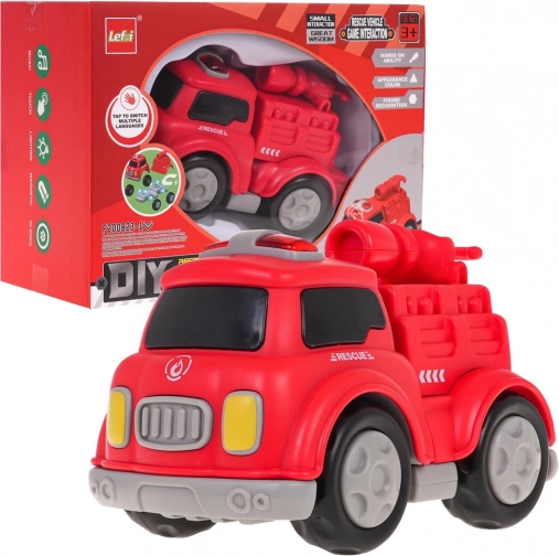 Interaktives Feuerwehrauto mit Magneten für Kinder ab 3 Jahren. Das Auto besteht aus hochwertigstem Kunststoff und hat Ton- und Lichteffekte. Durch Drücken des oberen Teils des Fahrzeugs hören Sie fröhliche Lieder, Feuerwehrsirenen oder Kinderlachen. Die Toneffekte werden von bunten Lichtern auf dem Dach des Fahrzeugs begleitet. Das Fahrzeug kann ohne Werkzeug zerlegt werden. Die einzelnen Teile sind mit Magneten versehen, sodass sie leicht und stabil miteinander verbunden werden können. Das Spielzeug wird mit 3 x AG13-Batterien betrieben (im Lieferumfang enthalten).