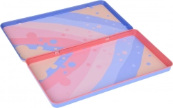 Ein bunter Kunststoffteller mit Deckel ermöglicht einfache Organisation und sichere Aufbewahrung des Spiels.