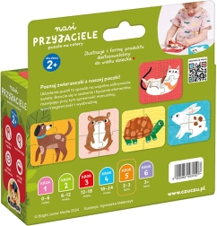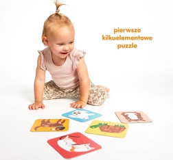 Entdecken Sie das lehrreiche Set Puzzle Unsere Freunde, das 5 vierteilige Puzzles mit farbigen Hintergründen zum leichteren Zusammensetzen enthält: