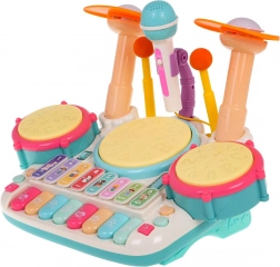 Interaktives Musikset, Klavier mit Trommeln für Kinder ab 3 Jahren. Das Musikalische Spielzeug besteht aus hochwertigstem Kunststoff in lebendigen Farben und unterstützt das Kind beim Spielen und beim Erlernen von Musikinstrumenten. Das Spielzeug kombiniert Schlaginstrumente und Klavier und ist mit einem Mikrofon und einem Soundsystem ausgestattet. Die Tasten erzeugen Klavier-, Trompeten-, Gitarrenklänge, Tierlaute sowie Zahlennamen. Drei Trommeln und ein Becken leuchten bei jedem Schlag mit den Sticks auf. Es gibt außerdem einen Lernmodus, bei dem auf den Trommeln Lichter erscheinen (ein Licht, Doppellicht, Dreifachlicht – mit unterschiedlicher Geschwindigkeit) und das Kind lernt, Rhythmen zu klopfen. Das Musikspielzeug verfügt über eine Lautstärkeregelung und einen Mikrofoneingang, der Teil des Sets ist. Das Spielzeug wird mit 4 AA 1,5-V-Batterien betrieben (nicht im Lieferumfang enthalten). . Funktionen des Sets: . - geeignet für Kinder ab 3 Jahren, .- hergestellt aus hochwertigstem Kunststoff, .- keine scharfen Kanten, .- lebendige Farben ziehen Kinderaugen an, .- beleuchtete Trommeln und Becken, .- Mikrofon mit Beschallung, .- Spiel- und Lernmodi, .- Klavier-, Trompeten-, Gitarren-, Tier- und Zahlenklänge, .- Lautstärkeregelung, .- Mikrofoneingang, . |