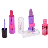 Glosse, Lippenstifte, Lacke, eine Lidschattenpalette mit Applikator und selbstklebende Tips – alles abgestimmt in verspielten Rosa‑ und Lilatönen.