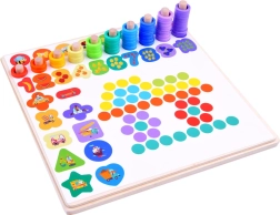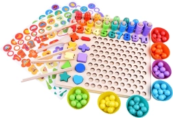Dieses umfassende Set fürs Kinderzimmer bietet eine bunte Vielfalt an Spielen und Aufgaben, die Lernen durch Spiel fördern. Kinder üben das Erkennen von Formen und Farben, lernen Zahlen und Mengen und genießen dank der Magnetangel das beliebte Angeln. Ebenfalls enthalten ist das Legen von Mustern aus Perlen und Kugeln nach Vorlagen – ideal für Konzentration und Geduld.