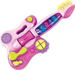 Die Gitarre ist mit 9 Tasten ausgestattet, die verschiedene Melodien und Klänge abspielen, und bietet 3 Musikmodi - Pop, Rock und Blues. Leuchtende Tasten, ein beweglicher Zylinder und ein rosa Hebel zum Ändern der Lieder sorgen für eine dynamische Unterhaltung, während die erweiterbare Kugel als Rassel dient.
