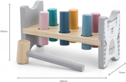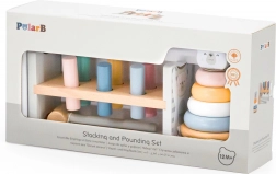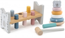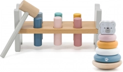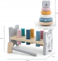 Das Set bietet zwei Spielzeuge für Kinder ab 12 Monaten – eine Pyramide und eine Klopfbank, beide mit einem niedlichen Bärenmotiv. Kinder können die farbigen Ringe der Pyramide in logischer Reihenfolge stapeln, während das Spiel mit der Klopfbank das Einklopfen farbiger Stifte mit dem beiliegenden Hammer umfasst. Bei Bedarf kann die Klopfbank gewendet werden, um das Spiel fortzusetzen.