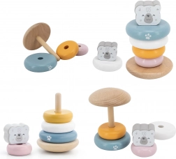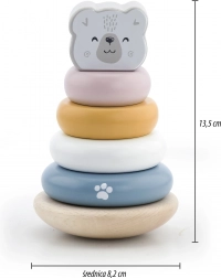 Die Holzpyramide enthält farbige Ringe, die aufeinander gestapelt werden, und wird von einer Bärenfigur gekrönt.