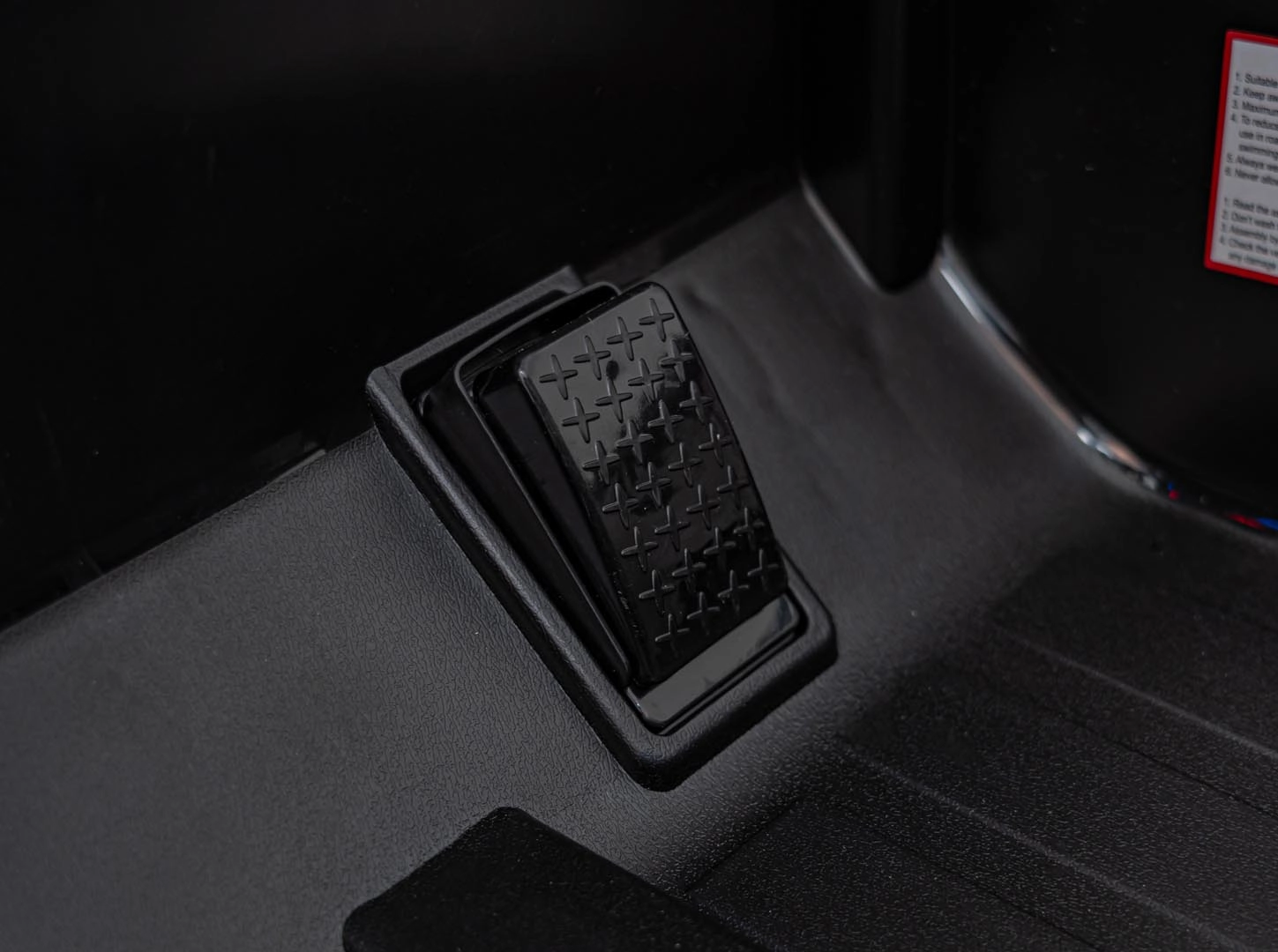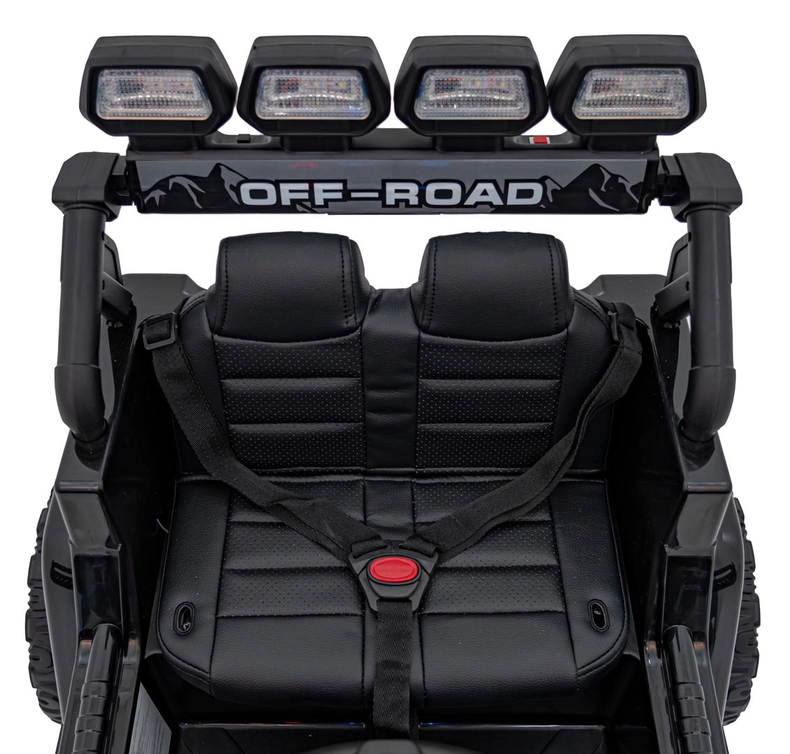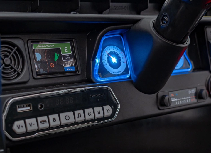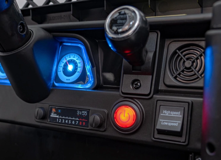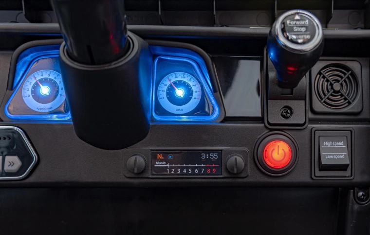 Dank der 2.4G-Fernsteuerung behalten Sie die Fahrt der Kinder unter Kontrolle – wählen Sie aus 3 Geschwindigkeiten und nutzen Sie bei Bedarf die Sicherheitstaste Stop. Das sanfte Anfahren schützt vor Ruckeln beim Losfahren. Der Innenraum mit Kunstlederbezug und Sicherheitsgurten bietet Komfort, das Audio-Panel mit USB/MP3/Bluetooth/AUX sowie Hupenfunktion am Lenkrad sorgt für Spaß.