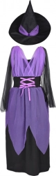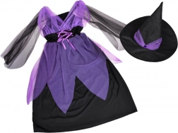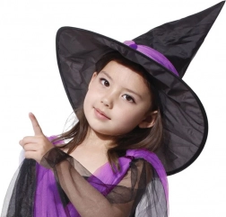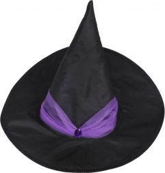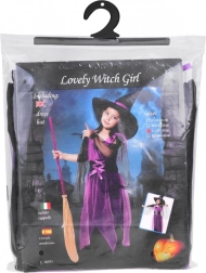 Der klassische schwarze Hut mit lilafarbener Verzierung ergänzt das Kostüm perfekt und unterstreicht die magische Hexenstimmung.