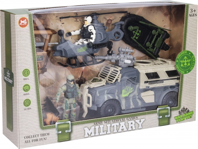 - Komplette Ausstattung: Fahrzeug, Hubschrauber, Boot, Turm, Waffen, Hund und 2 Soldatenfiguren