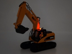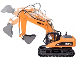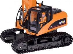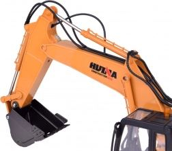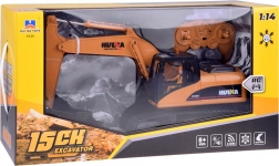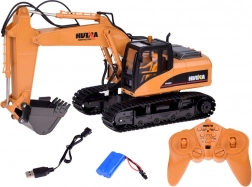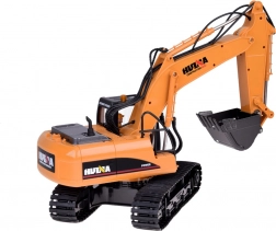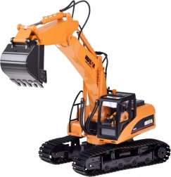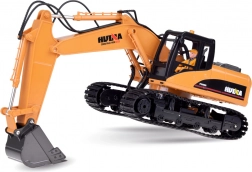 Realistischer RC-Bagger im Maßstab 1:14 von HUINA für kleine Baumeister. Er bietet 585° Kabinendrehung, vollen Bewegungsumfang von Arm und Schaufel, 2,4 GHz Steuerung, Licht- und Soundeffekte mit Abschaltfunktion sowie weiche Ketten für eine sanfte Fahrt. Die Stromversorgung übernimmt ein 7,4 V 500 mAh Akku mit USB-Ladung.