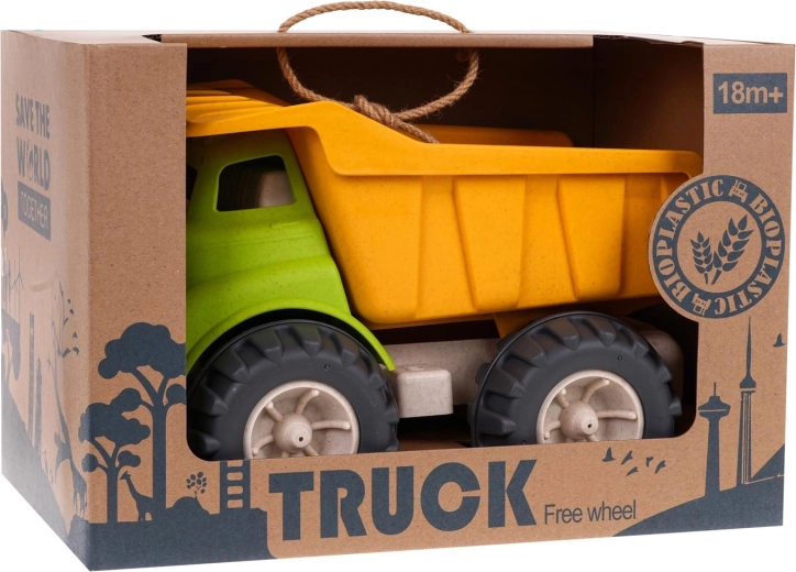 Kipplaster aus Bioplastik für Kinder ab 18 Monaten, hergestellt aus umweltfreundlichen Materialien, die sicher für Kinder und schonend für die Umwelt sind. Bietet bewegliche Elemente für kreatives Spielen und dank der großen Räder ideal für das Spielen im Freien.