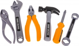 Schraubendreher, Hammer, Schlüssel, Zangen, Schutzbrille und Maske, Holzleisten sowie Befestigungsmaterial. Alles für kreatives Bauen und das Training der Feinmotorik.