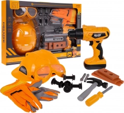 Helm, Handschuhe, Brille, Hammer, Schraubendreher, 3× Lochleiste, 4× Aufsatz, 4× Schraube, Akku-Bohrmaschine, Wechselbits (Schlitz, Kreuz) und Bohrer