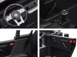 Die 2,4-GHz-Fernbedienung ermöglicht die Steuerung von Richtung, Geschwindigkeit (3 Stufen) sowie den Not-Stopp. Die Kinder sind durch 3-Punkt-Gurte geschützt.