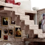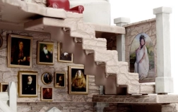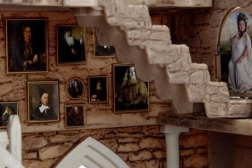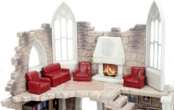 Kleines Modell eines Raumes mit antikem Stein und gotischen Bogenfenstern. Rote Stühle um den Kamin heben den gotischen Stil hervor.