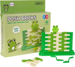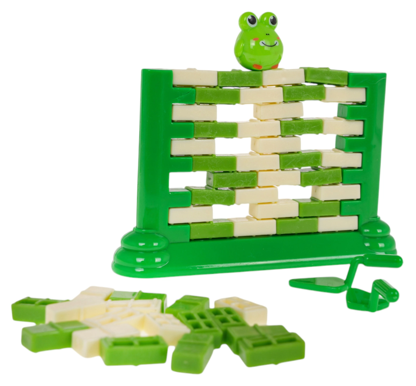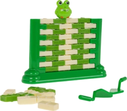 Ein unterhaltsames Geschicklichkeitsspiel für Kinder ab 3 Jahren, bei dem ihr aus „Ziegelsteinen“ eine Mauer baut und mit einem kleinen Löffel vorsichtig einzelne Steine herausdrückt. Oben sitzt eine kleine Froschfigur – das Ziel ist, dass sie nicht herunterfällt. Das Spiel fördert Konzentration, logisches Denken und die Hand-Auge-Koordination und bietet zugleich großen Familienspaß.