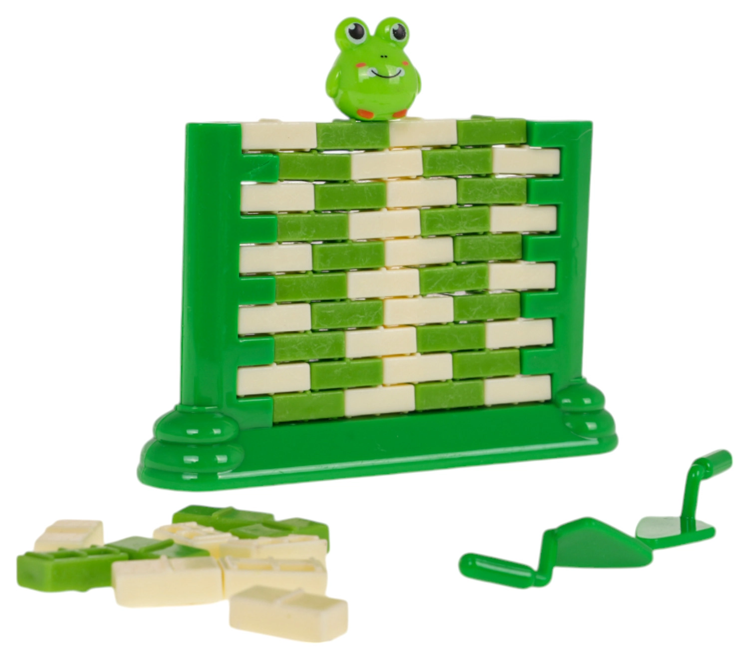Lieferumfang: Sockel für den Mauerbau, 22× grüner Ziegel, 22× weißer Ziegel, 2× Löffel, Froschfigur, dekorative Aufkleber.