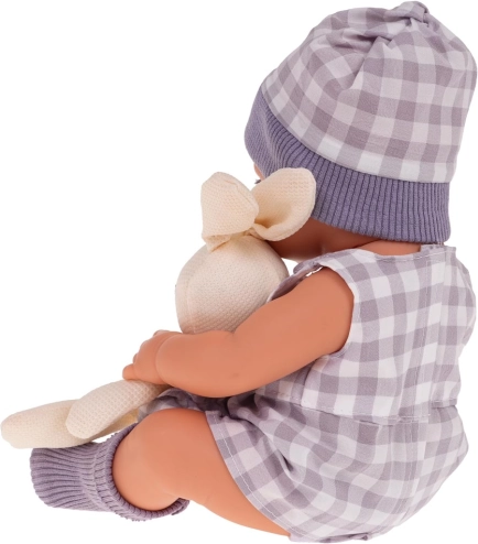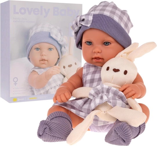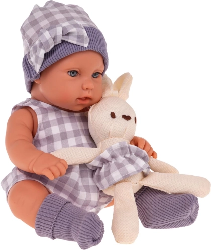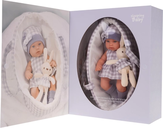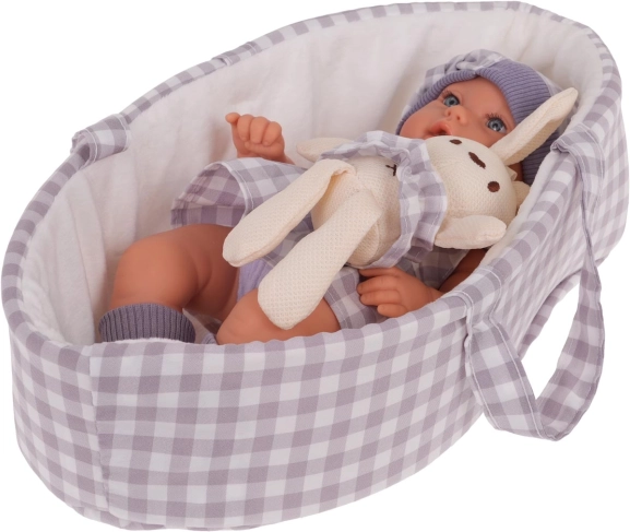 Niedliche Baby-Puppe in einem weichen Körbchen mit Plüschhäschen – ideal für Kinder ab 3 Jahren. Sie hat bewegliche Arme, Beine und einen Kopf, leicht ausziehbare Kleidung und ein leichtes Textilkörbchen mit Griffen für bequemes Tragen. Das Spielen mit der Puppe fördert die Feinmotorik und die Fantasie.