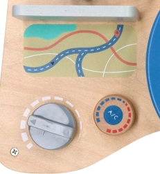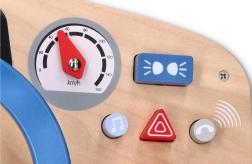 Das Holzlenkrad funktioniert ohne Batterien und bietet Kindern dank einer quietschenden Hupe und einem klickenden Knopf authentische Klangerlebnisse.