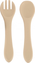 Dieses beige Silikon-Essset erleichtert Kindern das selbstständige Essen und sorgt bei Eltern für entspannteres Mahlzeiten-Handling. Saugnäpfe an Teller und Schüssel verhindern das Umkippen, der Becher mit Strohhalm unterstützt eigenständiges Trinken und das Lätzchen mit tiefer Tasche fängt herunterfallende Stücke auf.