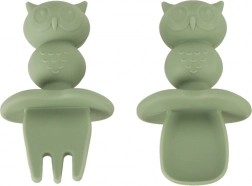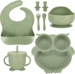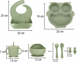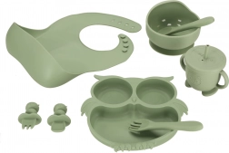 Praktisches und attraktives Silikon-Geschirrset für Kinder. Enthält alles, was Ihr Kind für bequemes und spielerisches Essen braucht. Das Eulenmotiv in olivgrüner Farbe ist nicht nur modisch, sondern erfreut auch jeden kleinen Esser.