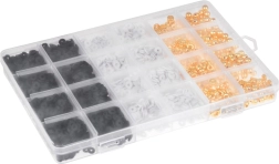 Die Komponenten des Sets können für verschiede Schmuckstücke wie Armbänder, Halsketten oder Ohrringe verwendet werden. Goldene Perlen fügen eine dekorative Note hinzu.