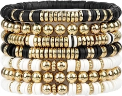 Stilvolle Armbänder aus diesem Set bestehen aus schwarzen, weißen und goldenen Perlen, die einen hochwertigen Lagen-Look erzeugen, ideal für jeden Anlass.