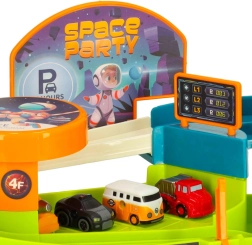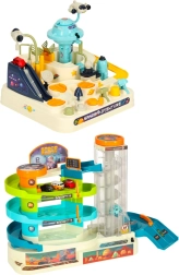 Die multifunktionale kosmische Autorennbahn bietet doppelte Aufregung und Spielmöglichkeiten. Dank ihrer zwei Strecken können zwei kleinere Rundkurse gestaltet oder zu einem großen verbunden werden, um zu beobachten, wie die kleinen Autos durch die kosmische Landschaft flitzen. Die große Bahn ist mit einem elektrischen Aufzug ausgestattet, der automatisch die Autos nach oben befördert, was für ununterbrochenen Spaß sorgt. Die kleinere Bahn enthält interaktive Elemente, die das Kind selbst bedienen muss, was seine manuellen Fähigkeiten fordert und entwickelt. Das Set enthält sechs Fahrzeuge, inklusive Polizeiauto und Betonmischer, was vielseitigen Spielspaß ermöglicht.