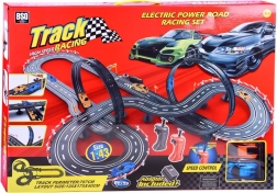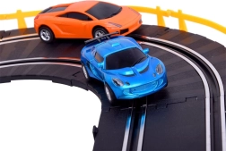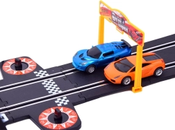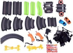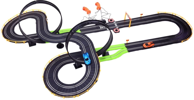 Rennstrecke mit zwei Schleifen und einer Streckenlänge von 787 cm bietet jedem Fahrer jede Menge aufregenden Spaß. Diese beeindruckende Strecke ermöglicht Rennen zu zweit und benötigt keine Batterien, da die Fahrzeuge über einen Adapter mit Strom versorgt werden.