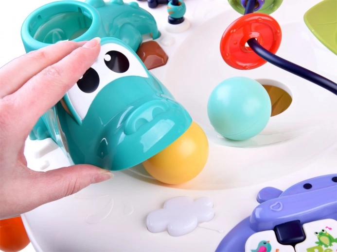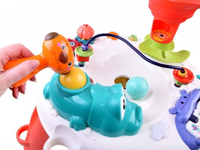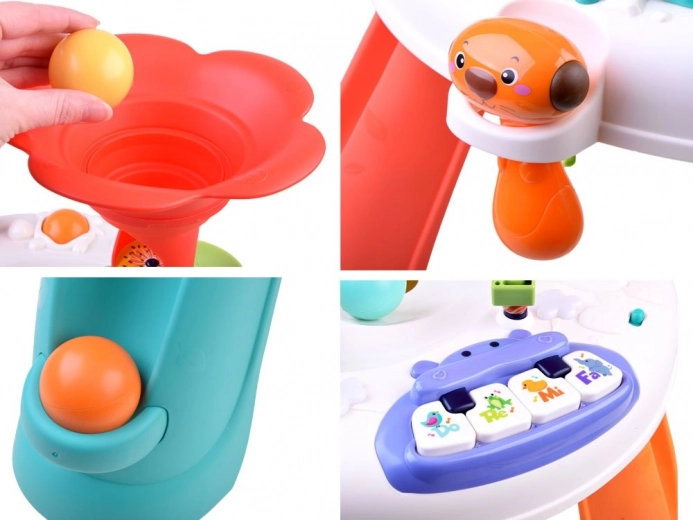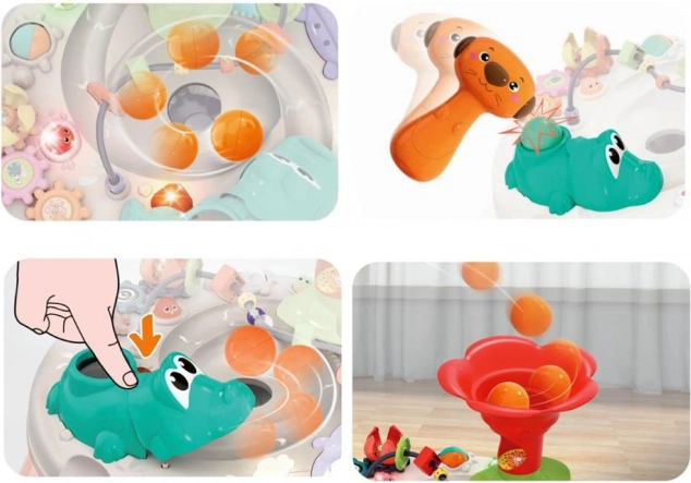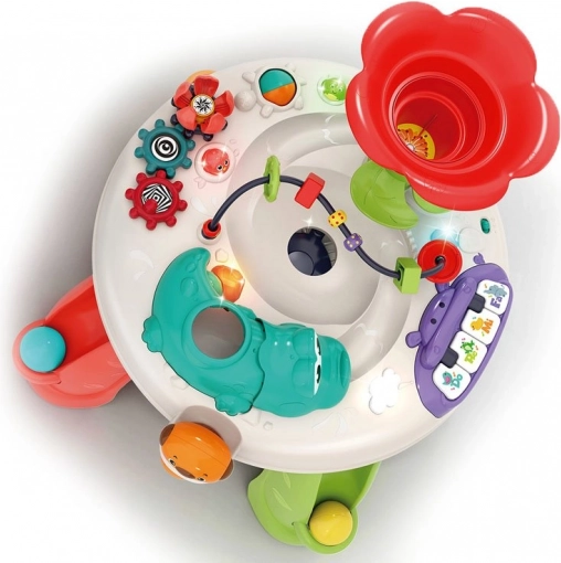 Der interaktive Kindertisch ist mit verschiedenen Elementen ausgestattet, die sensorische und motorische Entwicklung fördern. Durch Geräusche, Licht und Bewegung zieht er die Aufmerksamkeit der Kinder und hält sie beschäftigt.