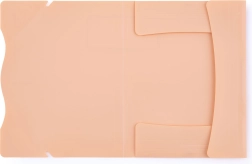 Mappe mit drei Klappen aus Polypropylen in pastell-aprikosenfarbener Farbe bietet einen Verschluss mit Gummiband und einen dehnbaren Rücken für eine Kapazität von bis zu 250 Blätter im A4-Format.