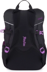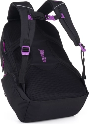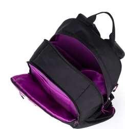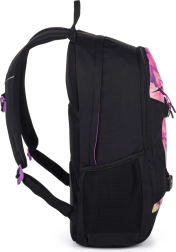 Die schwarze Basis wird durch ein rosa‑violettes marmoriertes Muster und markante Details ergänzt. Der Rucksack passt zur Schule, ins Büro und in die Freizeit.