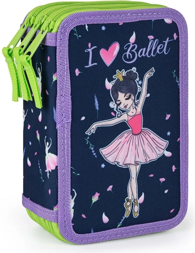 Elegantes dreistöckiges Mäppchen mit Ballerina-Motiv, ideal für Schulkinder. Es bietet 40 Gummischlaufen für die übersichtliche Aufbewahrung von Schreibutensilien, einen stabilen Reißverschluss mit großen Zippern für leichtes Öffnen sowie ein transparentes Fach für den Wochenstundenplan.