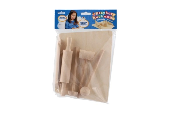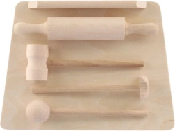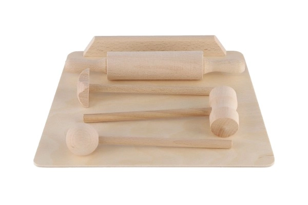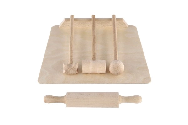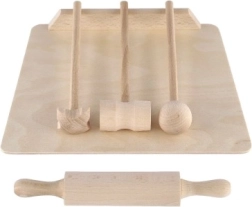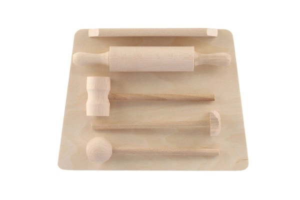 Schneidebrett, Teigroller und Klopfer sehen aus wie echte Küchenutensilien. Sie fördern das Nachahmungsspiel und die Entwicklung sozialer Kompetenzen.