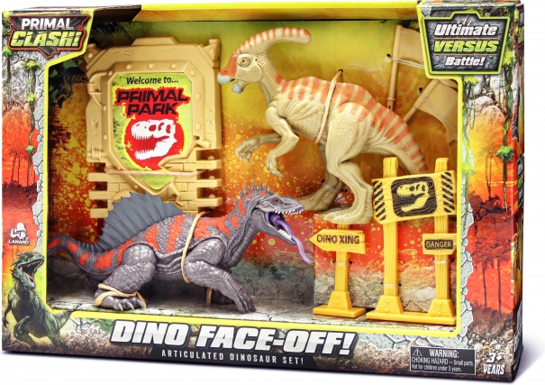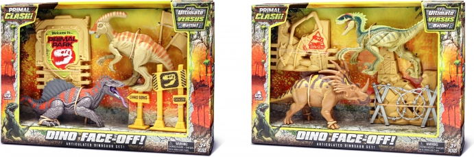 Entdecken Sie spannende Kämpfe mit dem Primal Clash! kämpfende Dinosaurier-Set. Dinosaurier in der Größe von 17 cm aus strapazierfähigem Material bieten großen Spaß und ein bewegliches Kiefer sorgt für Realismus.