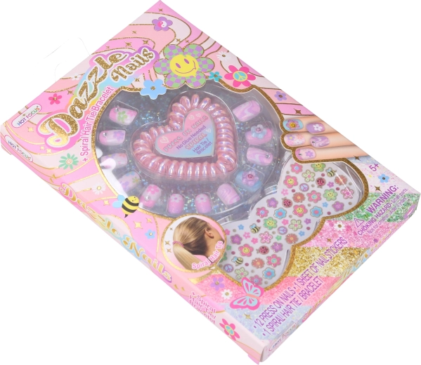 Aufklebende Nägel mit Aufklebern – Blümchen. Enthält aufklebende Nägel, Aufkleber, ein Haargummi. Die Nägel halten nach dem Andrücken, Kleber ist nicht erforderlich.