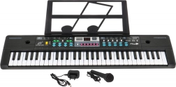 Lieferumfang: Keyboard, Netzadapter, Mikrofon, Notenständer. Stromversorgung über Netz (Adapter enthalten) oder 6× AA 1,5 V (nicht enthalten).