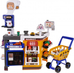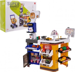 Kasse mit Schloss, öffnbarer Kühlschrank, Regale, Waage und eine Kaffeemaschinen-Attrappe schaffen eine realistische Supermarkt-Umgebung.