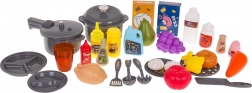 Schnellkochtopf, Topf mit Deckel, 3 Backbleche, Tellerchen, Becher, Küchenutensilien (Pfannenwender, Schöpflöffel, Pastalöffel, Messer), Gewürzstreuer, Saucen, Wasserflasche, Lebensmittelattrappen (Tomate, Karotte, Hähnchen, Fisch, Birne, Trauben, Desserts), dekorative Aufkleber