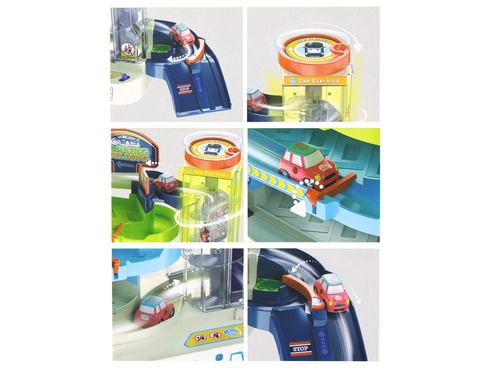 Jede der Parkebenen bietet vier Parkplätze, auf denen Kinder die beigefügten Autos mit Leichtigkeit parken können. Ein einzigartiges Merkmal ist der Aufzug, der es ermöglicht, Autos zwischen Ebenen zu bewegen. Beim Verlassen des Aufzugs fahren die Autos automatisch herunter, was ein dynamischeres und aufregenderes Spiel schafft.