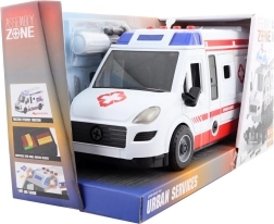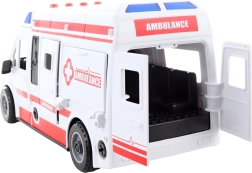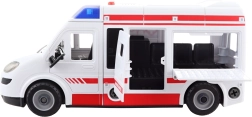 Das Modell wird mit 3× AG13 betrieben (im Lieferumfang) und bietet vier Soundmodi – Sirene, Hupe, Start und Melodie. Öffnende Türen auf der Fahrerseite und hinten erleichtern das Beladen der „Patienten“ auf die Trage sowie den Zugang zur Kabine.