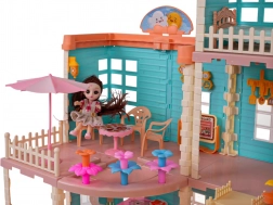 Im Set finden Sie eine vollständige Ausstattung inklusive 3 Puppen mit langem Haar, das sich gut kämmen lässt, Möbeln und Outdoor-Accessoires wie Schaukel, Sonnenschirm und sogar einem Tisch für Ping‑Pong. Das Haus besteht aus hochwertigem Kunststoff in lebendigen Farben, die sofort ins Auge fallen.