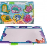 Diese doppelseitige Holztafel kombiniert Zeichnen und Puzzeln in einem kompakten Set. Auf der einen Seite befindet sich eine glatte Fläche zum Zeichnen mit dem mitgelieferten abwischbaren Marker mit Radierer, auf der anderen Seite eine Reliefplatte mit Aussparungen zum Platzieren der Holzteile mit Meerestieren. Kinder trainieren Fantasie, Geduld und Formerkennung.