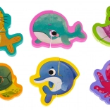- Puzzeln mit Motiven von Meerestieren (Seehund, Schildkröte, Delfin, Wal, Rochen, Oktopus)