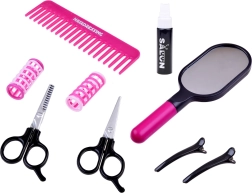 Schere, Kamm, Spiegel, Clips, Lockenwickler und eine Sprühflasche – alles im harmonischen Rosadesign für maximalen Spielspaß.