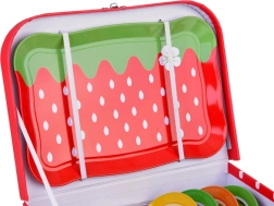 Das gesamte Set ist in einem stabilen Koffer mit Fruchtmotiv verstaut. Kinder können ihr Zubehör leicht wegräumen und den Teeservice überallhin mitnehmen.
