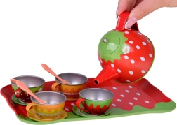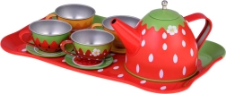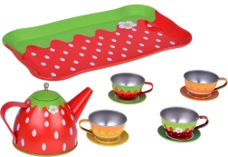 Kännchen, Tassen, Untertassen und Tablett aus Metall sind leicht, langlebig und liegen gut in kleinen Kinderhänden. Das Erdbeerdesign verleiht jeder Teestunde eine zauberhafte Atmosphäre.