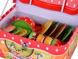 Das Kinder-Teeservice mit Fruchtmotiv besteht aus robustem Metall (Kännchen, Tassen, Untertassen, Tablett) und wird durch eine Kunststoff-dreistöckige Etagere sowie ein umfangreiches Set aus süßen und herzhaften Leckereien ergänzt. Alles ist in einem attraktiven Koffer verstaut – ideal zum Aufräumen und Mitnehmen.