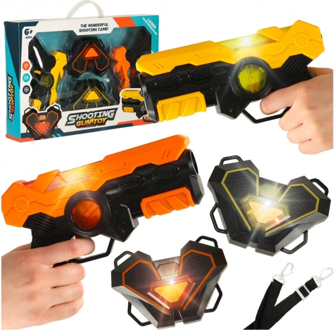 Unterhaltsames Set für Laser-Tag-Duelle drinnen und draußen: 2 Kinder-Infrarotpistolen und 2 interaktive Ziele mit Lichteffekten. Bietet ein actionreiches Spiel voller Emotionen, fördert schnelle Reaktionen und Präzision und unterstützt aktive Bewegung im Freien. Reichweite bis zu 15 m, einfache Bedienung und klare Regeln – gewinnt, wer dem Gegner alle 6 Leben abnimmt.